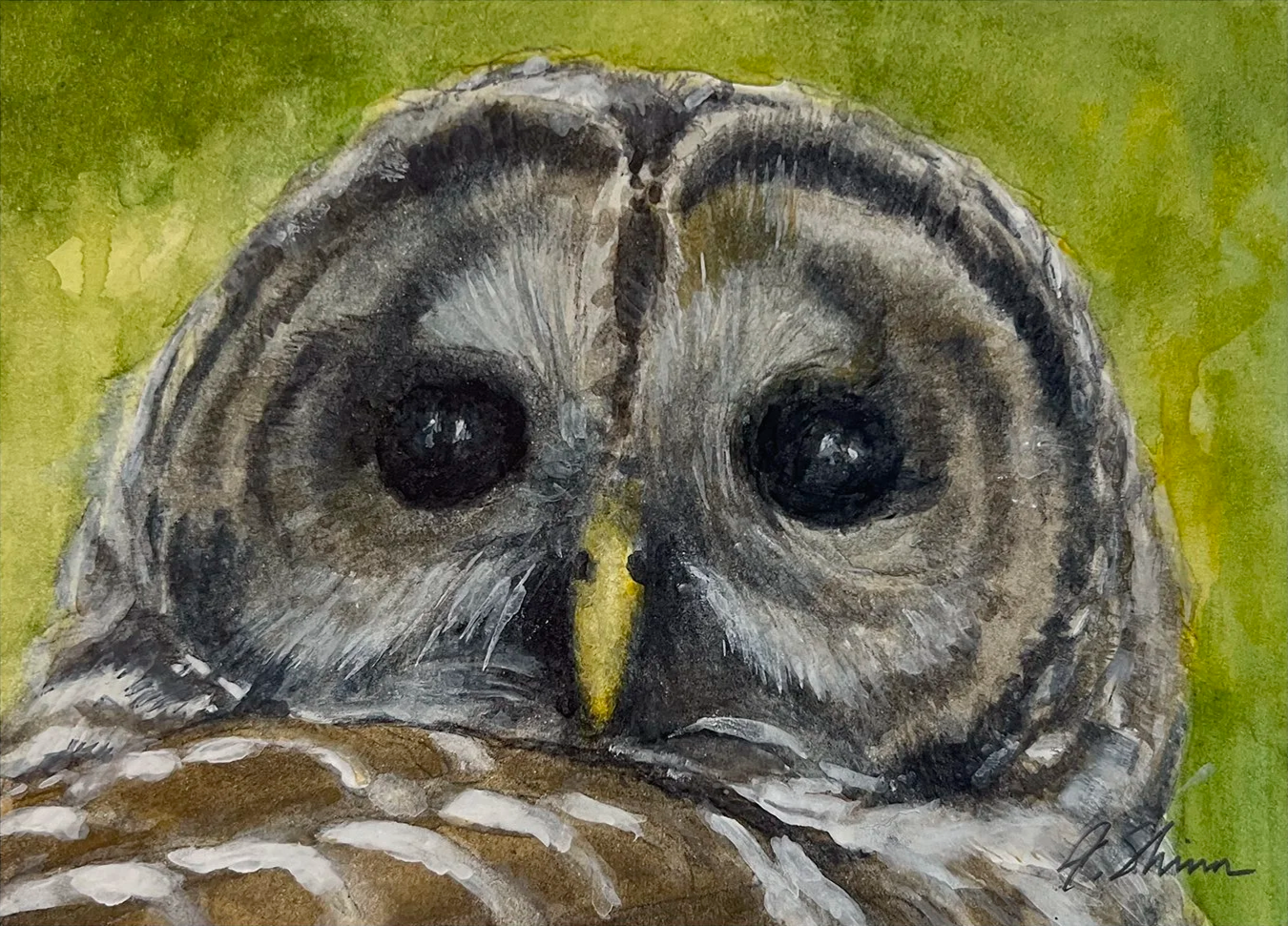 Barred Owl — watercolor and gouache, 4.5 x. 6.5, $300